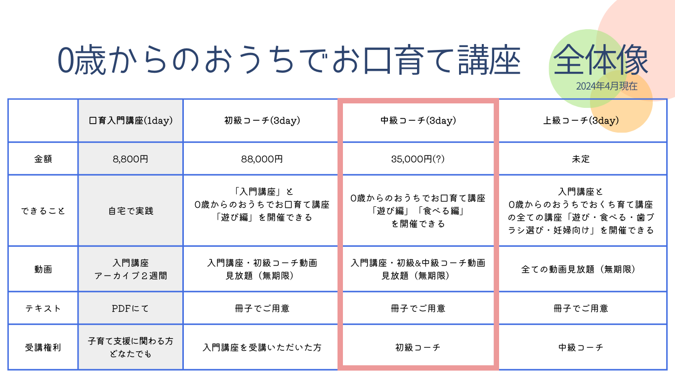 ・0歳からのおうちでお口育て中級コーチ養成講座 の受講権利が与えられます。