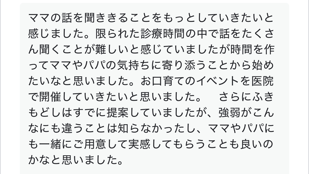 ママの話を聞き取ることをもっとしていきたいと感じました。限られた診療時間の中で話をたくさん聞くことが難しいと感じていましたが、時間を作ってママやパパの気持ちに寄り添うことから始めたいなと思いました。お口育てのイベントを医院で開催していきたいと思いました。さらに吹き戻しはすでに提案していましたが、強弱がこんなにも違うことは知らなかったし、ママやパパにも一緒にご用意して実感してもらうことも良いのかなと思いました!